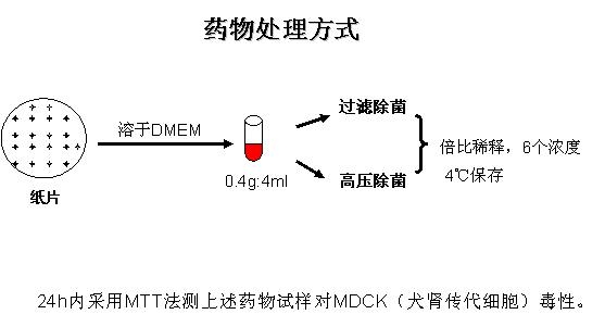 将新的抗流感病毒药物固载于无纺布或纸上,形成新的抗流感病毒材料(简称药物)做前期处理和抗流感病毒实验如下: