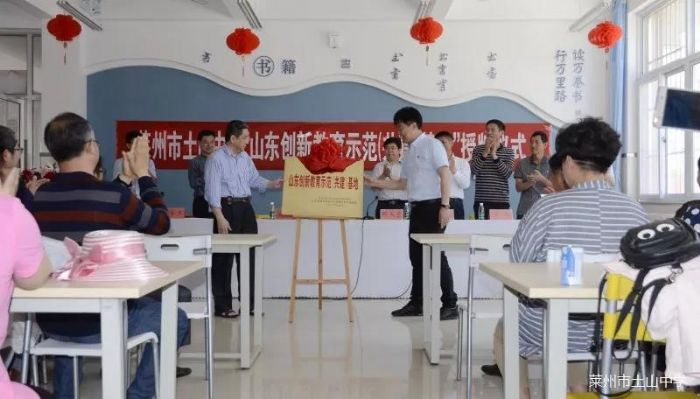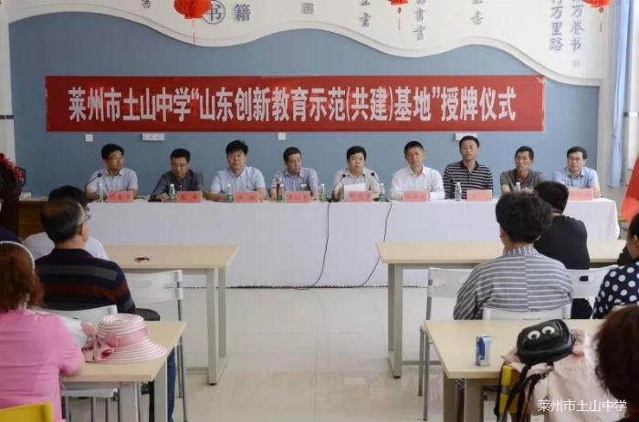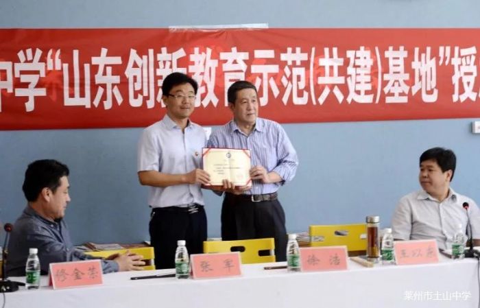 授牌仪式上,市教体局领导、省教育装备中心领导分别致辞,对土山中学办学业绩给予了充分肯定。北京青少年自然科学研究院王以东副院长向土山中学校长颁发了“山东省创新教育示范(共建)基地”证书,山东省教育厅装备中心研究员邵天宇主任与土山镇徐浩副镇长共同为土山中学“山东创新教育示范(共建)基地”揭牌。