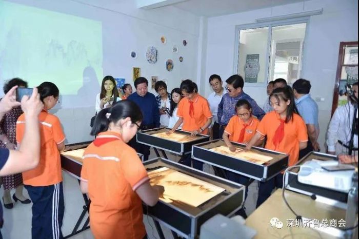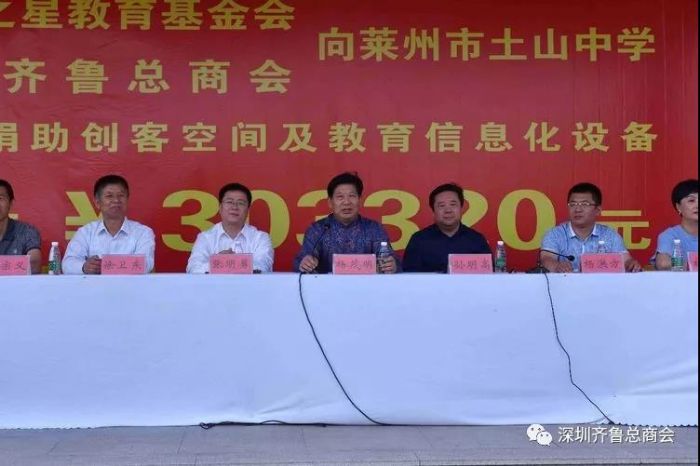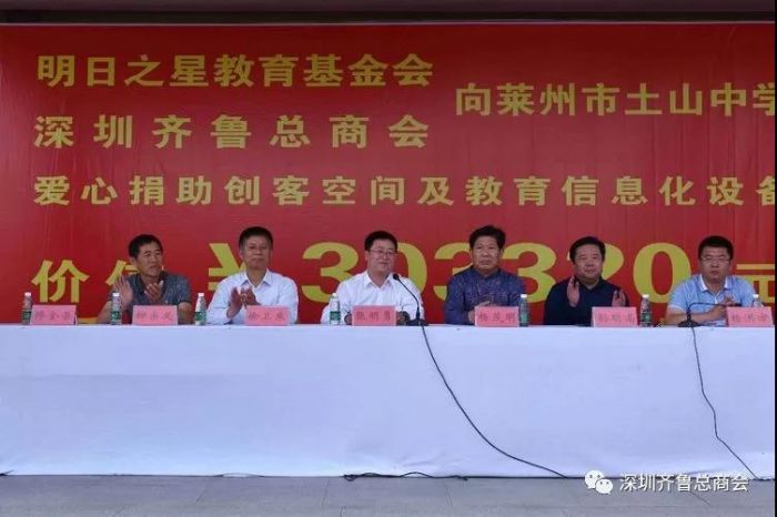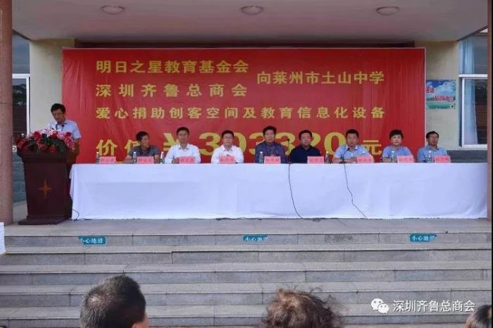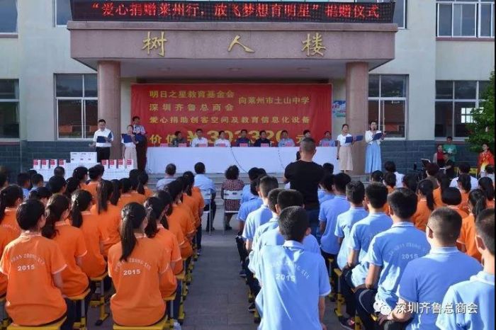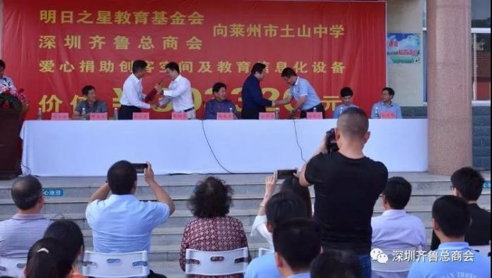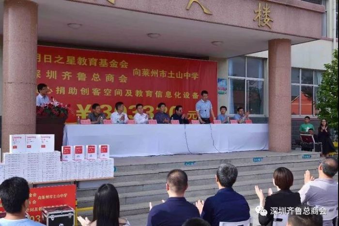 在教学楼前广场举行了隆重的捐赠仪式,出席捐赠仪式的领导有:原12集团军副军长、深圳齐鲁文化研究会名誉会长杨茂明将军;广东省山东商会深圳分会会长、深圳乐天成控股集团董事局主席孙明高博士;农工党中央专委会委员、全国山东商会战略联盟副主席、山东省工商联执行委员会执委、明日之星教育基金会会长张明勇先生,广东省山东商会深圳分会副会长徐伟、李洪贵以及张志鑫秘书长、珠江银行初晓丽行长、土山中学校友会代表潘秋华女士等,土山镇镇长杨洪方、莱州市教体局党委委员徐卫东、莱州市教育技术装备与研究中心主任柳宗义,莱州市责任督学孙万刚督学陪同参加活动。