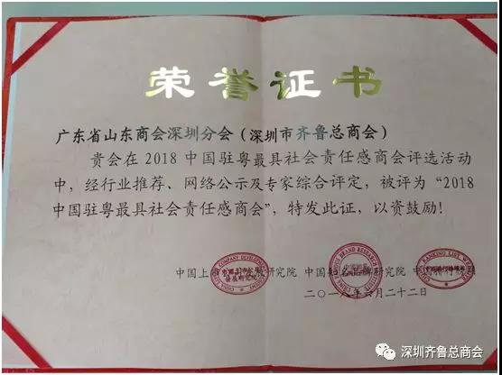 鉴于广东省山东商会深圳分会、广东省山东商会深圳分会在广东商会界的区域影响力、凝聚力、创新力、组织建设、服务会员、社会责任,弘扬商邦竞争文化,推动社会力量参与幸福广东改革开放经济建设事业等方面贡献突出,经广东省山东商会推荐以及对专家评价和网络民意调查进行客观、公正的综合评定后,广东省山东商会深圳分会、广东省山东商会深圳分会被评为“2018中国驻粤最具社会责任感商会”。