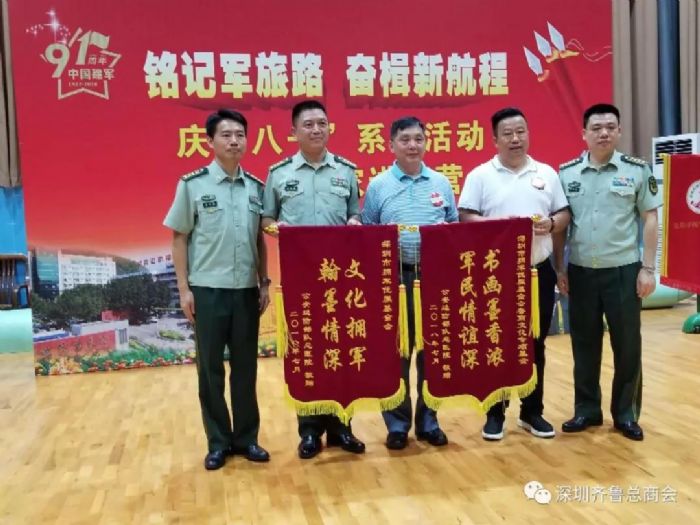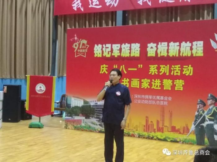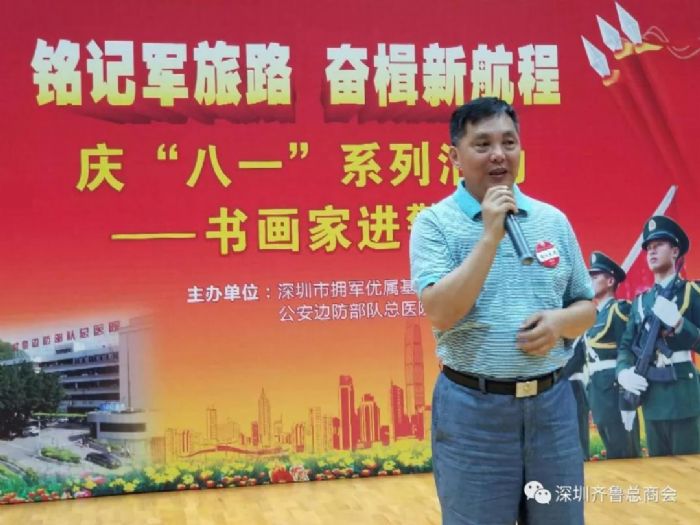 7月31日下午,正值“八一”建军节到来之际,深圳市拥军优属基金会联同深圳市公安边防部队总医院于总医院隆重举办了一场以“‘铭记军旅路 奋楫新航程’庆‘八一’系列活动”为主题的庆祝活动。山东省鲁商联盟会常务副会长、广东省山东商会常务副会长、广东省山东商会深圳分会会长、深圳市齐鲁文化研究会会长孙明高陪同原深圳经济特区检查站政委、深圳市拥军优属基金会副理事长兼秘书长王为群等领导,以及众多爱心书法家、企业家一同前往深圳市公安边防部队总医院,为医院官兵送来亲切的问候、节日的祝福以及崇高的敬意。