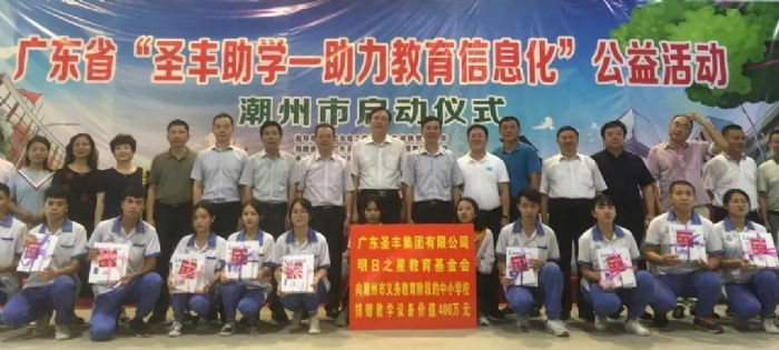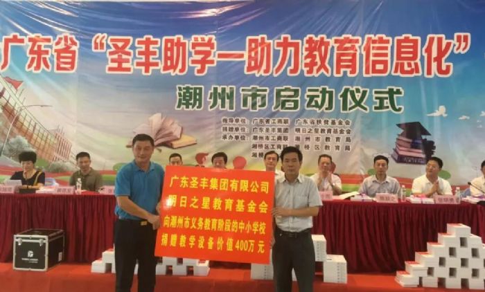 本次公益活动,广东圣丰集团有限公司、明日之星教育基金会积极响应省委省政府领导的号召,捐赠了价值3500万元的创客空间与教育信息化设备,向潮州市捐赠价值400万元的教学设备。希望借此微薄之力,凝聚一份社会责任,传播一种社会真情,让更多孩子分享到信息化教育带来的乐趣,进而推动教育发展、促进教育公平最大化。此举既弘扬了扶弱济困、捐资助学的传统美德,也为全社会传递了奉献爱心、共创和谐的理念,是一项实实在在的民生工程。