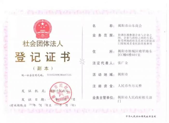 揭阳市山东商会是由揭阳市金运五金实业有限公司张广金先生牵头近百家企业发起,并报山东省政府,经省政府领导研究同意在揭阳市民政局注册成立揭阳市山东商会,于2018年8月2日正式领到了登记证书。
