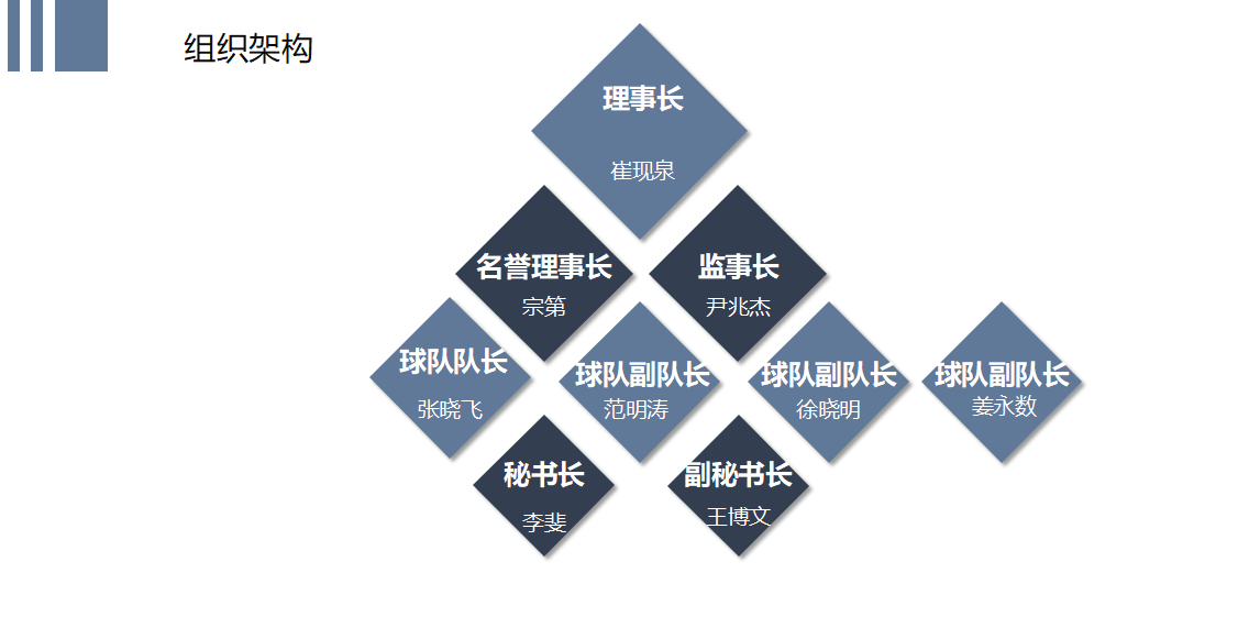 会上,张晓飞队长首先表达了自己对球队的愿景。随后,与会人员在已有的高尔夫球队运营经验的基础上,通过集思广益,最终确定了鲁商(粤深)高尔夫俱乐部的初始章程、会费标准和积分规则,并进行球队纳新,暂定了组织架构,具体如下: