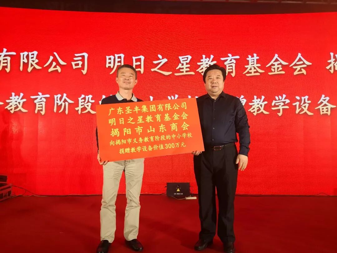 捐赠仪式上,广东圣丰集团有限公司、广东省山东商会深圳分会常务副会长单位明日之星教育基金会、揭阳市山东商会联合为揭阳市义务教育阶段的中小学校捐赠了价值300万元的教学设备。广东省山东商会常务副会长、明日之星教育基金会名誉理事长、广东省山东商会深圳分会孙明高会长作为捐赠单位代表进行捐赠,揭阳市教育局陈育文局长作为受赠代表接收爱心教学物资。