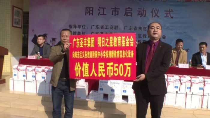 活动中,广东圣丰集团、广东省山东商会深圳分会常务副会长单位明日之星教育基金会共同向阳江市义务教育阶段的中小学捐赠价值240万元的教育信息化设备,向阳东区义务教育阶段的中小学捐赠50万元的教育信息化设备。作为受赠学校之一,雅韶中学相关负责人表示,将不断提高教育水平和教学质量,用优异的教学成绩回报社会和爱心企业的关爱。