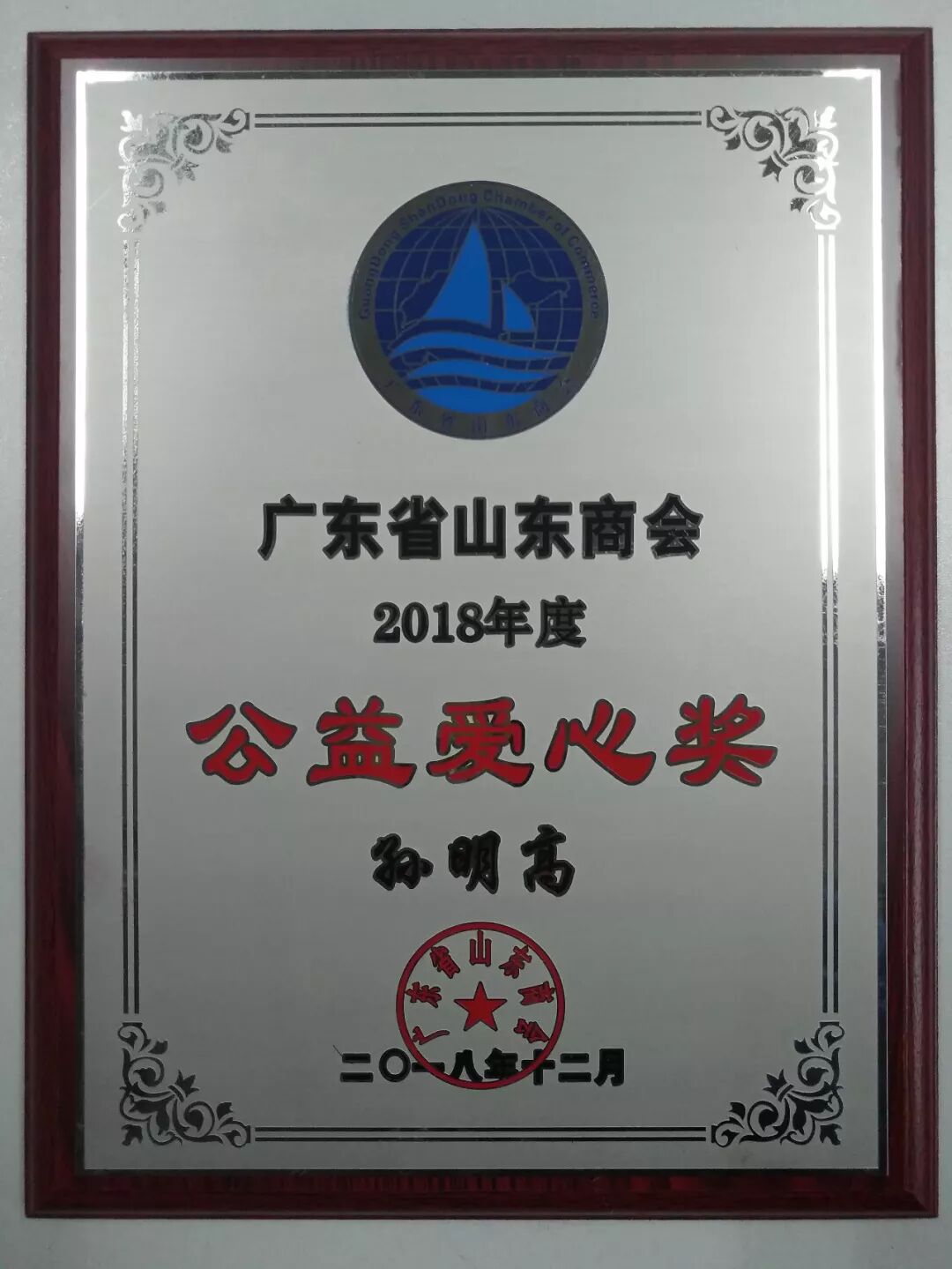 2018年12月20日,以“开创儒商新动能,共建儒商新发展”为主题的中共广东省山东商会联合委员会暨广东省山东济南商会成立大会,在广州圣丰索菲特大酒店成功召开。鉴于孙明高会长2018年来致力建设“爱心型商会”,孜孜不倦地投身慈善公益爱心事业,慷慨解囊、捐款捐物,在广东省内外多个地市留下了慈善公益的足迹,在助学、助困、扶贫、救急、弘扬文化、关爱军人等方面做了许许多多实事。会上,广东省山东商会正式授予山东省鲁商联盟会常务副会长、广东省山东商会常务副会长、广东省山东商会深圳分会会长、深圳市齐鲁文化研究会会长“2018年度公益爱心奖”,杨茂明将军为孙明高会长颁奖。