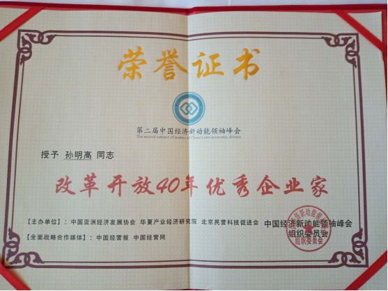鉴于孙明高会长在从业期间,以处于改革开放前沿窗口的深圳为事业根据地,深入学习和运用改革开放精神内涵和工作方法服务政府、服务企业、服务社会,为国家创造出了经济效益、文化效益、生态效益以及社会效益。经大会组委会全面、公正、客观的鉴定,正式授予山东省鲁商联盟会常务副会长、广东省山东商会常务副会长、广东省山东商会深圳分会会长、深圳市齐鲁文化研究会会长孙明高“改革开放四十年全国优秀企业家”荣誉奖项,以此肯定和鼓励孙明高会长多年来为推动改革开放进程所作出的贡献。