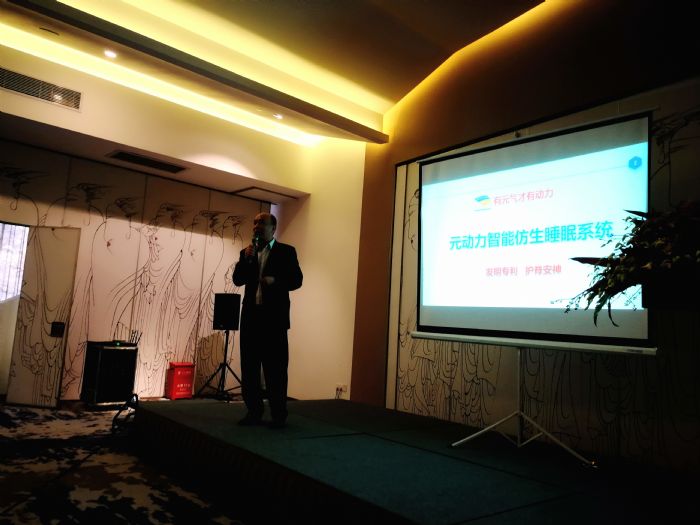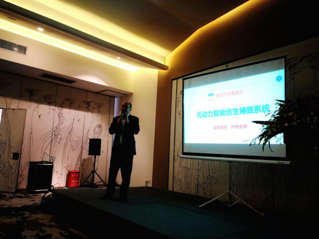 路演的第一个项目——“元动力系列产品城市合伙人计划”,由广东珠元健康科技有限公司董事长杨民军作推介分享。结合现代人睡眠质量普遍不高和护脊睡眠才是理疗最好的保健方式的需求痛点,杨民军先生详细介绍了具有护脊安神功效的“元动力智能仿生睡眠系统”发明专利和城市合伙人的运营模式。