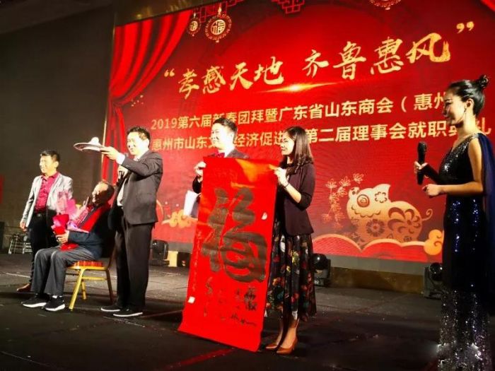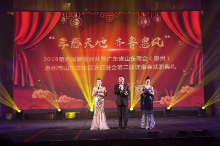 2月16日,农历正月十二,第六届“孝感天地,齐鲁惠风”2019新春团拜暨广东省山东商会惠州分会、惠州市山东文化经济促进会第二届理事会就职典礼在惠州富力万丽酒店绚丽开幕。广东省山东商会深圳分会副会长兼政府金融商会会长许德学、广东省山东商会深圳分会副会长兼医疗商会会长杨庆、广东省山东商会深圳分会会长办公室主任刘静代表我会应邀出席此次盛典。