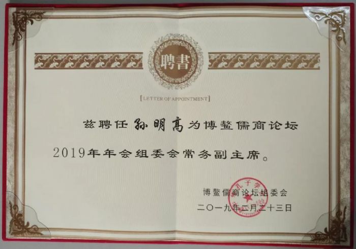 大会作出重要决议:为新增补的组委会领导成员颁发聘书,孙明高会长受聘为博鳌儒商论坛2019年年会组委会常务副主席。作为组委会领导班子的重要一员,孙明高会长在担任博鳌儒商论坛2019年年会组委会常务副主席期间,必将积极履行工作职责,全心全意参与博鳌儒商论坛2019年年会筹备工作,全力以赴为全球儒商奉献一场精彩文化盛典。