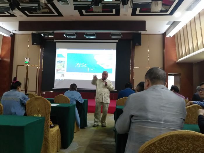 此次讲座以“放下”为主题,由来自台湾的国学、佛学心经大师曾子源教授主讲,共分为三大环节:一是讲解“为什么要吃素?吃素的好处?”;二是讲解“累世因、果与六道轮回的关系”;三是诵读和讲解《般若波罗多蜜心经》心经。