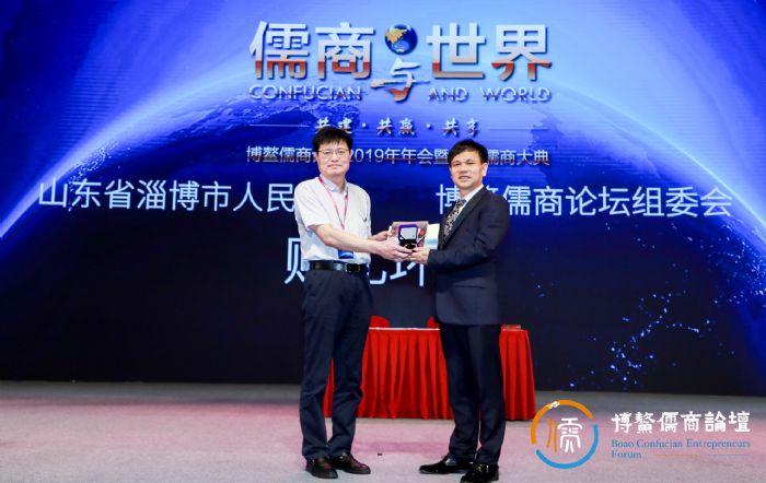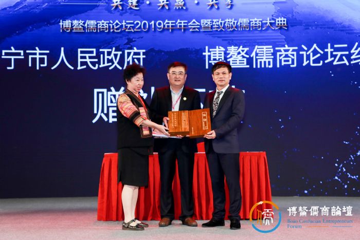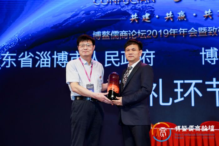 赠礼环节,济宁市政府、淄博市政府分别与博鳌儒商论坛组委会相互赠送纪念品留念。