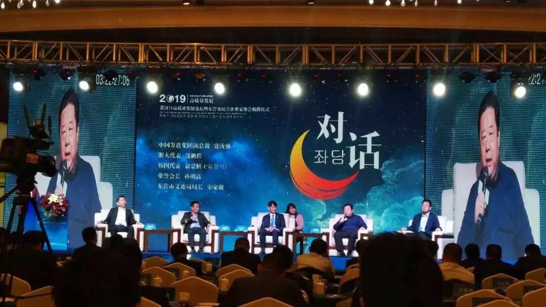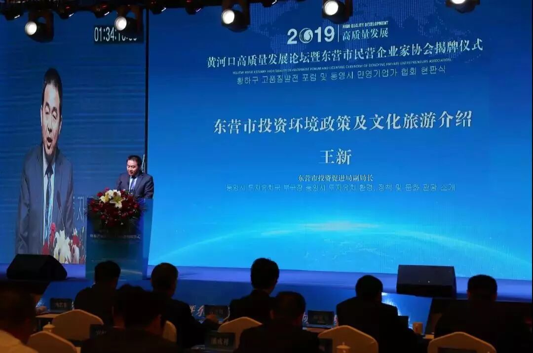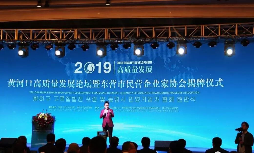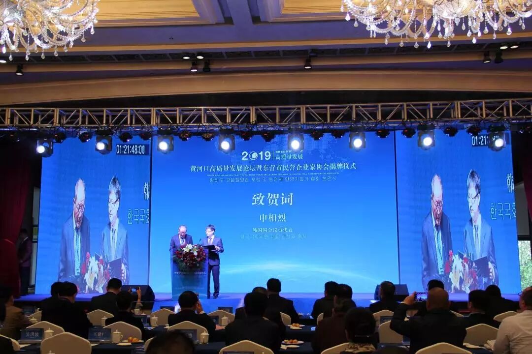 4月25日,由东营市文化和旅游局、东营市投资促进局联合主办,由东营市民营企业家协会、中国黄河文化经济发展研究会创新发展促进会、黄河口创业研究院承办的“黄河口高质量发展论坛” 在蓝海御华大饭店召开。韩国代表团韩国国会议员、韩国绿色能源(株)总顾问申相烈一行,孙中山教育基金会代表蔡再辉,东营市委常委、市人民政府、市人大、市政协、市委统战部、市文化与旅游局、市投资促进局、经济技术开发区滨海临港产业区等各级政府领导,东营民营企业家协会荣誉会长、华泰集团董事长李建华,中国万达集团副总裁寇汝强,浙江大学博士、副研究员、硕士生导师聂鹏程,经济学家、浙江大学科学技术与产业文化研究中心副理事长、研究员颜景海,东营市民营企业家协会轮值会长、华纳集团董事长徐绥远,各兄弟商会代表,东营企业家代表,新闻媒体等450余人参加会议。山东省鲁商联盟会常务副会长、广东省山东商会常务副会长、广东省山东烟台商会会长、广东省山东商会深圳分会会长、深圳市齐鲁文化研究会会长孙明高、广东省山东商会深圳分会副会长兼政府金融商会会长许德学一行应邀出席。