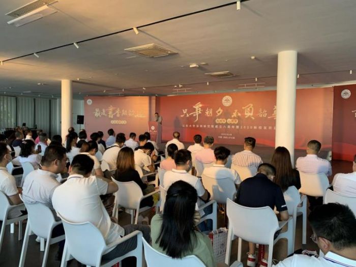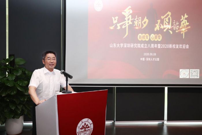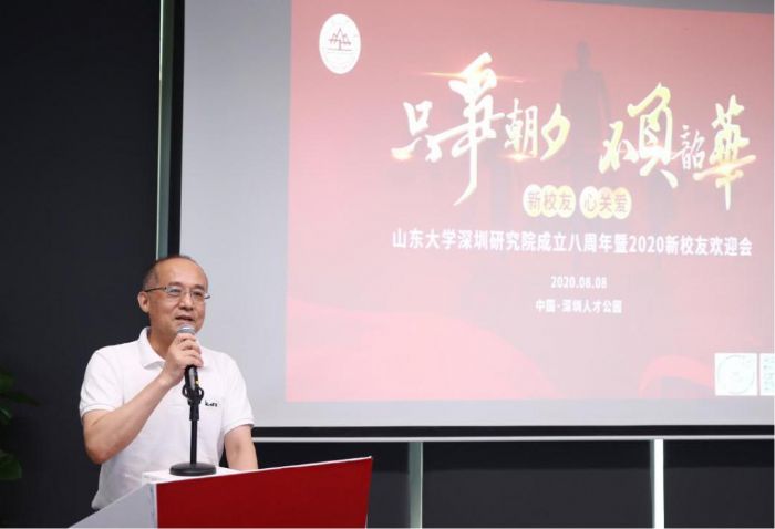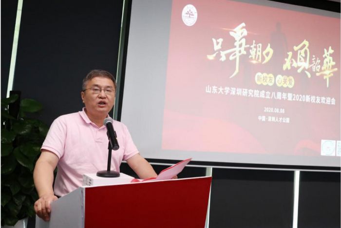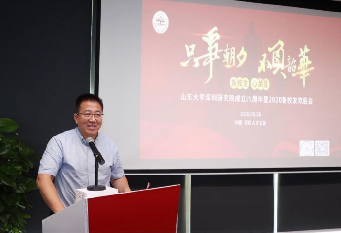 王立新代表深圳校友会和山东商会对研究院八年来取得的成绩表示祝贺,对2020届新校友的到来表示热烈欢迎。随后他介绍了校友会和山东商会近年来的工作。他表示,深圳校友会在学校和深圳研究院的大力支持与帮助下,始终坚持围绕服务校友、服务学校、服务地方经济社会发展开展工作,同时山东商会始终发扬"包容厚德,诚信共赢"的商会精神,努力在服务深圳鲁商、促进鲁深经济交流与合作等方面发挥积极作用。最后他对新校友表达了祝福与期望,希望新校友在深圳这片热土上成就梦想,勇攀高峰,永远铭记母校的培养,为母校增光添彩。