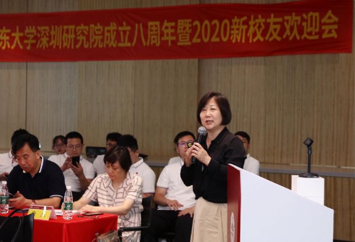 戎雪亚代表深圳科技创新战略研究中心讲话。她说,山东大学深圳研究院自2012年进驻虚拟大学园以来,稳扎稳打,飞速发展,连续三年被虚拟大学园评为“优秀研究院”,取得巨大的成就。同时鼓励2020年来到大湾区求学就业的山大新校友们勇敢地创业,在深圳这片热土上发光发热,为深圳建设做贡献,同时祝愿深圳研究院的发展越来越好,为市校共建,合作共赢贡献山大力量。