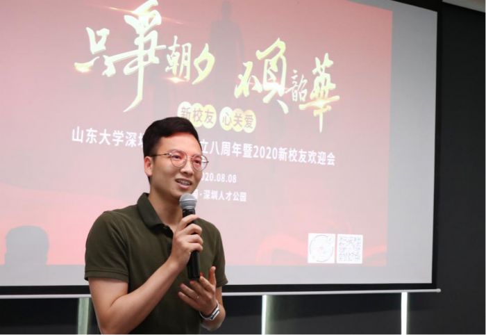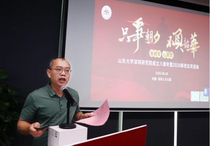陈卓代表2020届新校友发言,他对学校、深圳研究院、校友会的各位领导和筹办此次新校友欢迎会的各位老师致以崇高的敬意和最衷心的感谢!他表示,从山东到广东,两千公里的距离,弥漫的是母校绵延不绝的关怀,深圳研究院为新校友架起了与母校沟通的桥梁,搭建了校友之间交流的平台,他倡议同学们积极参与活动,也希望各位校友能在今后的工作和生活中相互帮助,相互扶持,为母校山东大学添彩争光,祝福研究院越来越好!