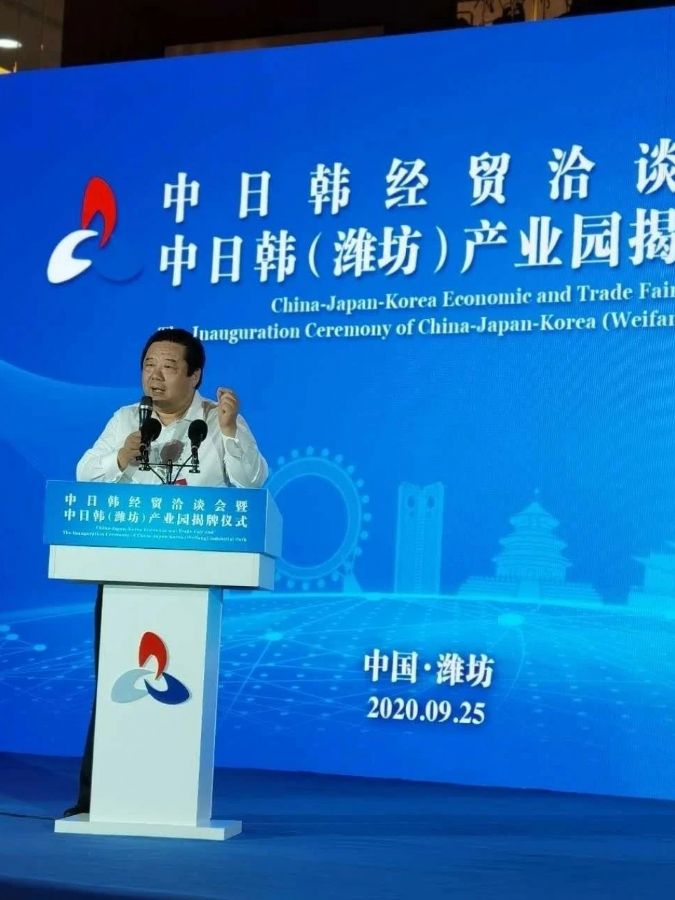 2020年9月25日,为拓展多领域、深层次经贸合作空间,积极推动中日韩经贸合作向覆盖面更宽、融合度更深的方向发展,中日韩经贸洽谈会暨中日韩(潍坊)产业园揭牌仪式在潍坊鲁台会展中心会议中心圆满举行。韩国驻青岛总领事馆总领事朴镇雄,日本驻青岛总领事馆总领事井川原贤出席,潍坊市委副书记刘运出席并致辞,潍坊市人大常委会副主任顾建华主持。