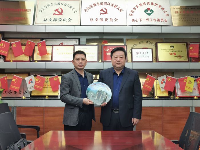交流后,临沂市委人才发展服务中心胡尊敬副主任代表临沂市委组织部向广东省山东商会深圳分会颁发“临沂市干部培训实践单位”牌匾,并向孙明高会长赠送了临沂市第一批广深研学实践队纪念品。