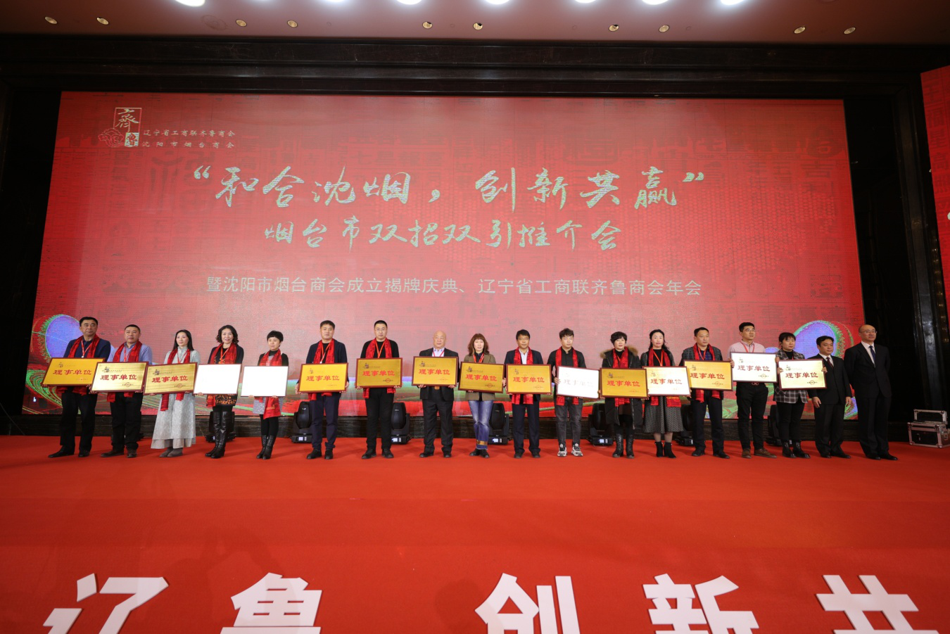 2020年12月16日,“和合沈烟·创新共赢”烟台市“双招双引”推介会暨沈阳市烟台商会揭牌庆典在沈阳举办。烟台市委常委、市委统一战线工作部部长金志海,烟台市委统一战线工作部常务副部长、烟台市工商联党组书记王天立,烟台市工商联党组成员、副主席于岩君,烟台市投资促进中心副主任夏滨,沈阳市工商联主席侯巍,鲁商联盟会常务副会长、广东省山东商会常务副会长、广东省山东烟台商会会长、广东省山东商会深圳分会会长孙明高,深圳市山东烟台商会会长孔繁鹏、秘书长车雪涛,沈阳市烟台商会会长宋伟滨等领导应邀出席此次活动。