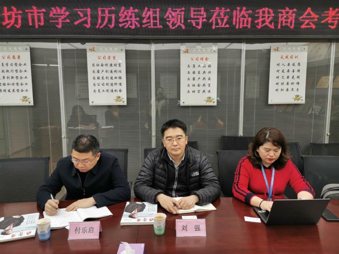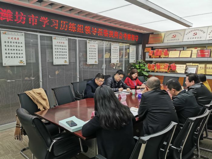 2021年1月14日,潍坊市委统战部副部长、侨办主任、第三批学习历练组组长刘强,全国蔬菜标准质量中心书记、第三批学习历练组副组长付乐启,潍坊市科技合作中心科长王琳琳一行莅临我商会考察指导。鲁商联盟会常务副主席、广东省异地商会联合会执行会长、广东省山东商会常务副会长孙明高热情接待了刘强副部长一行,就深化商会与潍坊市合作,以及潍坊市委政研室综合研究科科长鞠杰在商会的学习历练情况进行了交流。商会常务副会长赵延军、焦虹陪同交流。