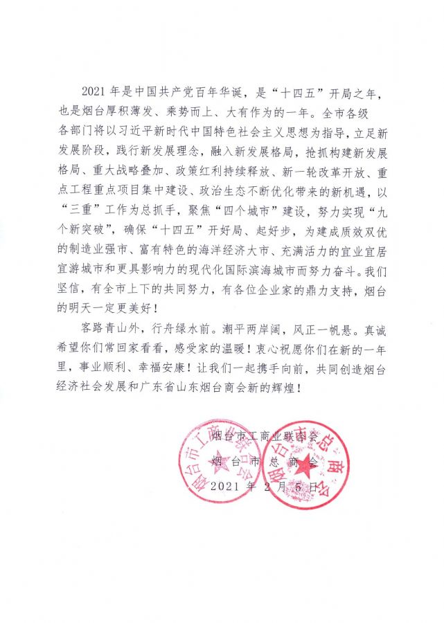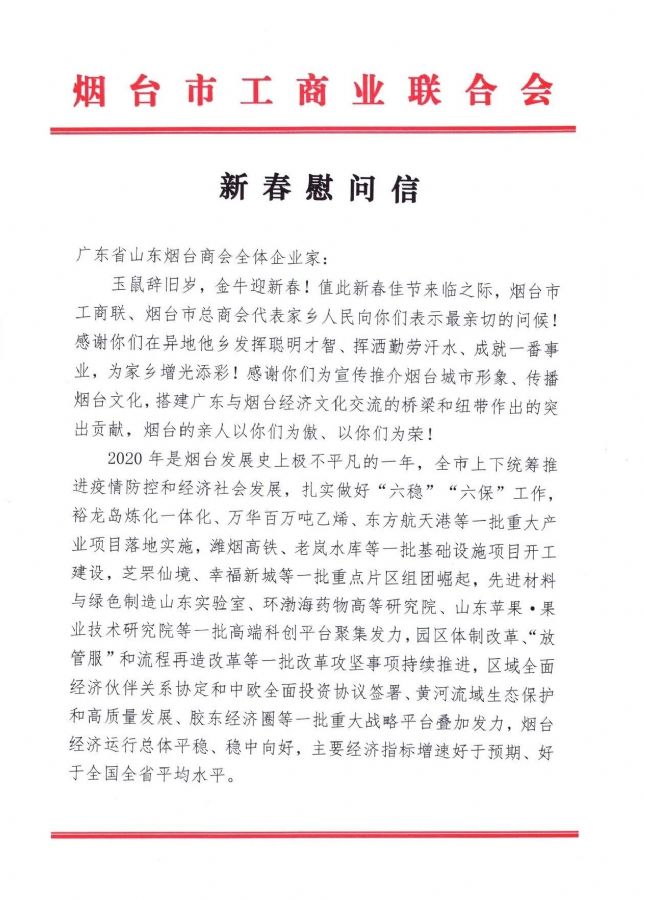 值此新春佳节来临之际,烟台市工商联、烟台市总商会代表家乡人民向大家表示最亲切的问候!特发来新春慰问信,原文如下: