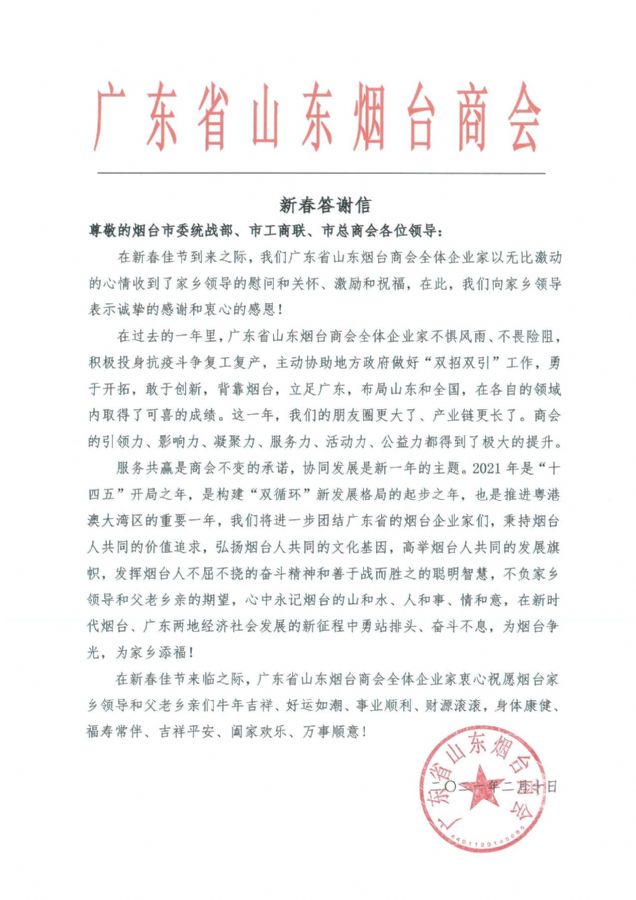 在新春佳节到来之际,我们广东省山东烟台商会全体企业家以无比激动的心情收到了家乡领导的慰问和关怀、激励和祝福,在此,我们向家乡领导表示诚挚的感谢和衷心的感恩!新春答谢信正文如下: