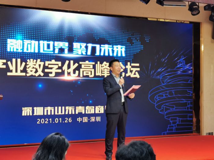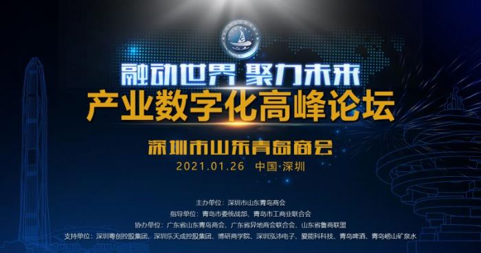 青深相拥、互联互通。2021年1月26日下午,由深圳市山东青岛商会主办,青岛市委统战部、青岛市工商业联合会指导,广东省山东青岛商会、山东省鲁商联盟会协办,深圳市乐天成控股集团、深圳市粤创控股集团支持举办的2021智造创新青岛产业数字化高峰论坛,在深圳市福田区深南大道6002号深圳人民大厦3楼深圳厅圆满举行。青深两地的政府领导、企业家、商协会代表,以及部分青岛体悟实训干部共聚鹏城,以“在世界的深圳助力世界的青岛”为主题,围绕数字经济、产业数字化、数字产业化展开交流。
