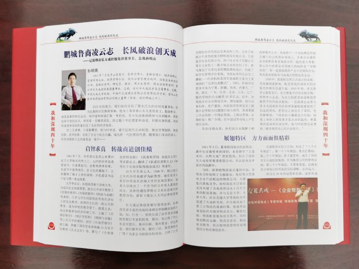 为庆祝深圳经济特区成立四十周年,展现来深建设者和开拓者的奋斗历程,弘扬深圳精神,记录四十年改革成果,见证深圳由荒芜跻身国际化都市的历史变迁,九州出版社收编了在各行各业辛勤耕耘并做出突出贡献的代表人物的个人事迹,出版了《我和深圳四十年》。书中特邀到全国人大财经委员会副主任委员、原深圳市委书记成功李灏提笔作序,记述了鲁商联盟会常务副会长、广东省山东商会常务副会长、广东省异地商会联合会执行会长、深圳市乐天成控股集团董事长孙明高等多位深圳老拓荒者可歌可泣的创业故事,真实地再现了当年深圳建设者们拓荒的历史画卷。