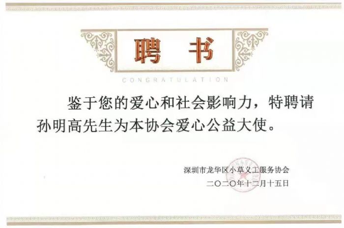 这一组组充满爱心的数据,不仅仅是爱的符号,更代表了孙明高会长踏入公益慈善之路里程中的刻度与高度,也获得了社会各界的充分认可和一致好评。先后荣获齐鲁英才“十佳年度人物”“公益爱心奖”“热心奉献奖”、深圳市龙华区小草义工服务协会“爱心公益大使”“爱心企业”等荣誉称号。