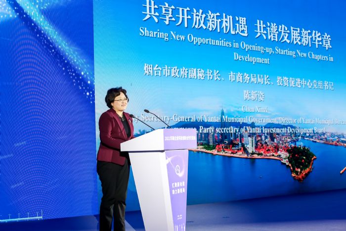 烟台市政府副秘书长、市商务局局长陈新姿推介烟台市营商环境
