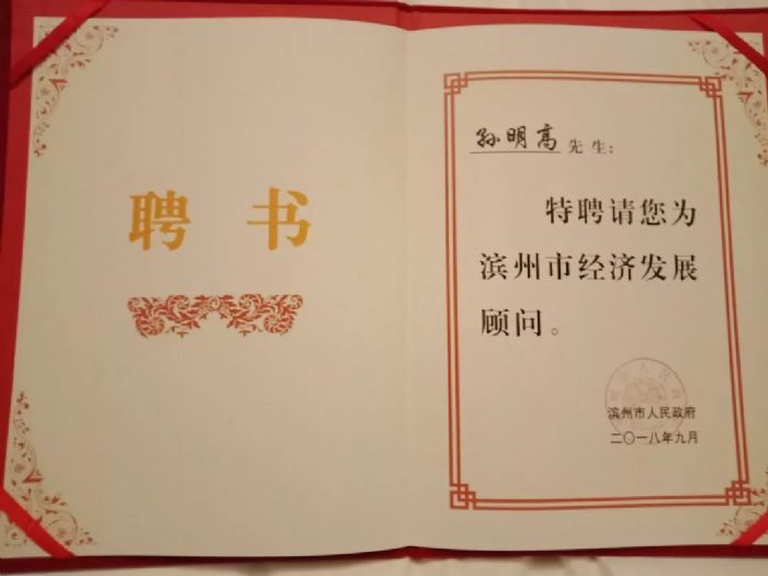 鉴于孙明高会长杰出的经济管理水平能力和经营管理业绩享誉国内工商界和管理科学界,既是谙熟经济发展规律的独立经济学家,又是驰骋商场几十年、经历过风浪的优秀企业家,也是多家商协会的主要负责人和多家政府的高级智囊。2018年9月,滨州市人民政府聘请孙明高会长为经济发展顾问。近日,滨州市沾化区人民政府正式聘请孙明高会长为经济发展顾问。
