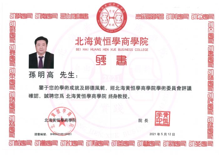 鉴于孙明高会长是集政产学研金智文会于一身的复合型专家、学者、企业家、投资银行家和独立经济学家。近日,经北海黄恒学商学院学术委员会评议确认,诚聘孙明高会长为北海黄恒学商学院终身教授。