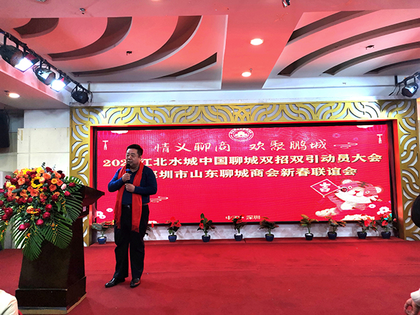 2022年1月10日,2022江北水城中国聊城双招双引动员大会暨深圳市山东聊城商会新春联谊会在深圳新东源国际酒店圆满举行。来自深圳各界的山东聊城老乡一同参与大会。鲁商联盟会常务副会长、广东省山东商会常务副会长兼深圳会长、广东省异地商会联合会执行会长、深圳市齐鲁文化研究会会长孙明高,我商会常务副会长、深圳市淄博商会会长赵磊,我商会秘书长杨立振、执行秘书长尹兆杰应邀出席大会。