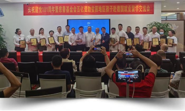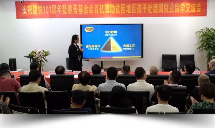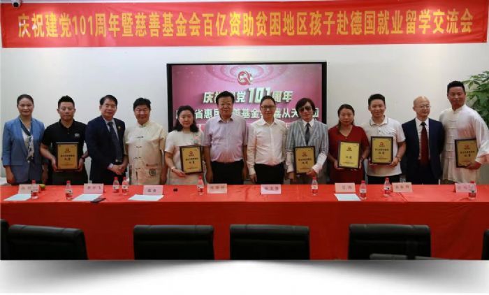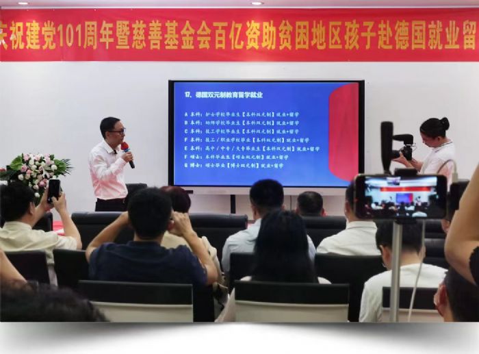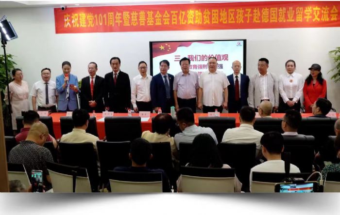 在庆祝建党101周年的2022年7月1日,“深圳喜从天教育集团”联合“广东省惠民慈善基金会”,发起了“慈善公益助学就业工程”计划,向社会募集资金和资源,帮助中国目前还处于贫困的家庭,但又是一群有志向,有才华的年轻人,资助他们去德国学习精工制造的技术,学成回国创造“大国工匠”的伟业!