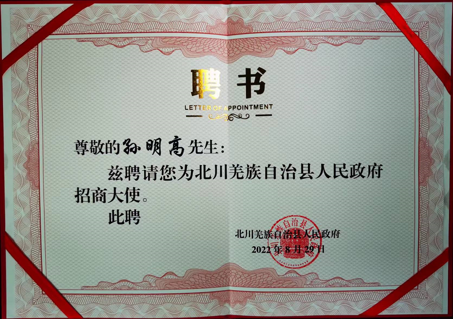 忆往昔,山东对口援建北川新城建设;看今朝,鲁商有责任和义务援助北川振兴。此次,被聘为北川羌族自治县人民政府招商大使,既是对孙明高会长多年来招商引资服务工作的肯定,更是鞭策。未来,我们将积极发挥商会“圈链会盟”的力量,丰富招商信息渠道,为北川“双招双引”事业添砖加瓦,助力北川“文旅兴县、乡村振兴、特色美食”建设。