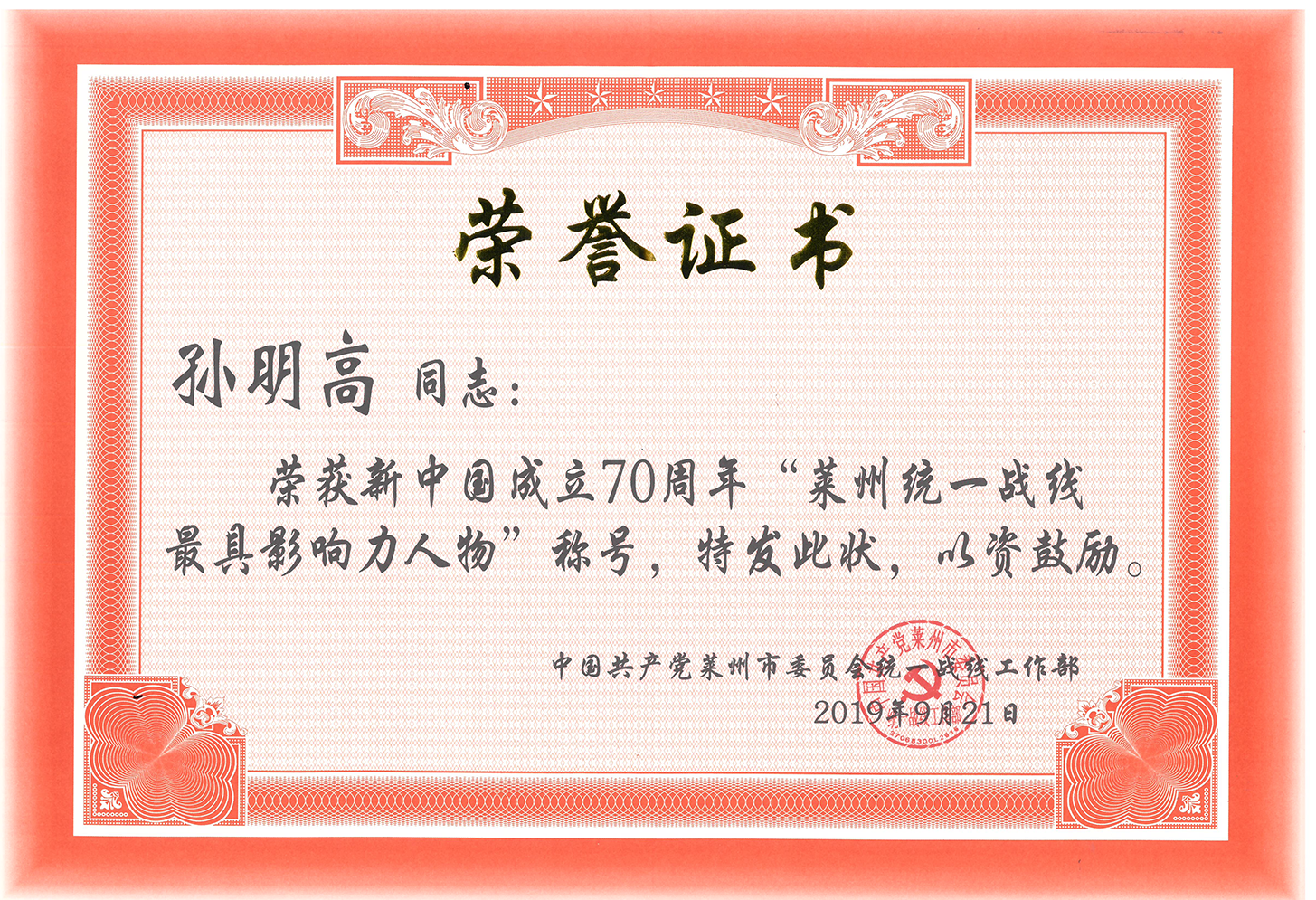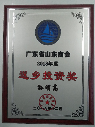 孙明高会长先后荣获国家级的投资专家、中国管理顾问与咨询实战名家、博鳌儒商卓越人物、儒商文化传播优秀工作者、《齐鲁颂歌》齐鲁英才“十佳年度人物”、鲁商优秀企业家、最具影响力新粤商、新中国成立70周年莱州统一战线——最具影响力人物、新中国成立70周年—社会责任企业家等称号。广东省山东商会多次给予孙明高会长商会建设奉献奖、热爱贡献奖、返乡投资奖等荣誉。