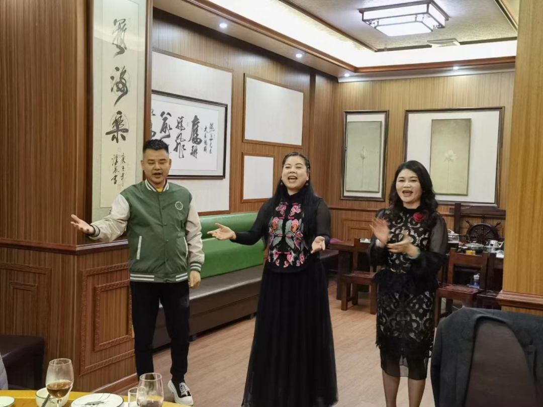广西民建艺术团林涌泉团长,组织带领他们的“台柱子”中国变脸歌王、广西六堡茶推广大使卫东,壮族民歌歌后黄春艳,壮族舞蹈双胞胎姐妹金花银花等前来,为福世博(广西)数字科技有限公司的成立献上精彩表演、表示祝贺。