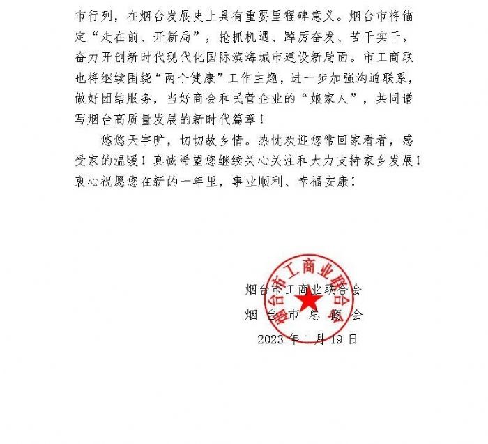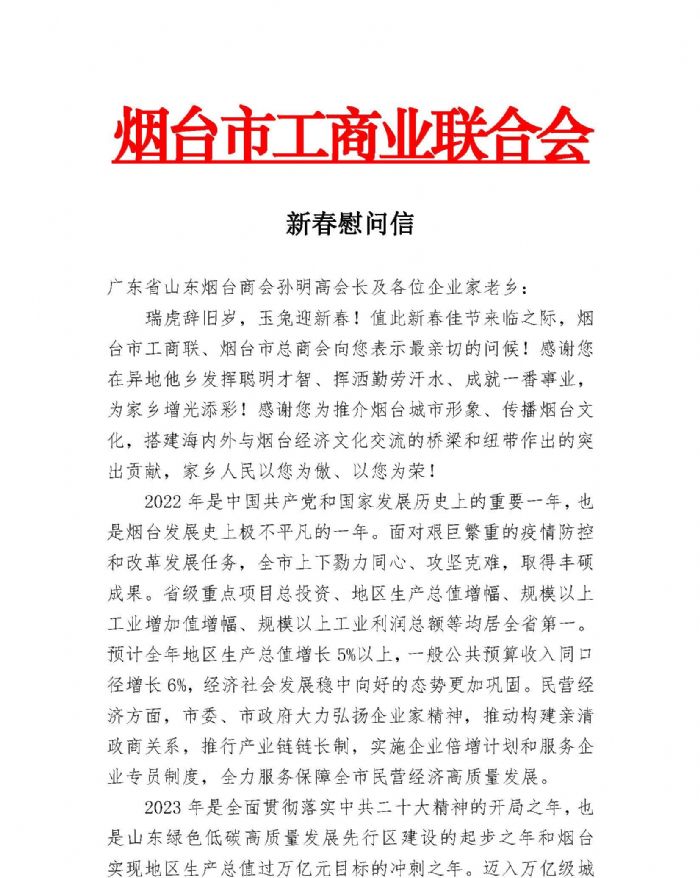 烟台市工商业联合会致广东省山东烟台商会企业家的一封信