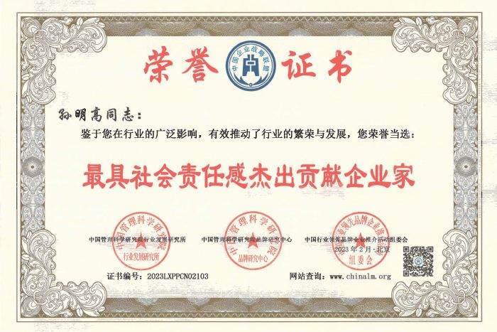 鉴于孙明高会长在弘扬文化、捐资助学、拥军优属、拥政爱民、尊老爱幼、助困帮扶、抗击疫情、教育办学、绿色环保、智慧管理、投资银行、双招双引、知识管理等方面做出的突出成绩,以及在行业的广泛影响,有效推动行业的繁荣与发展。近日,中国管理科学研究院行业发展研究所、中国管理科学研究院品牌研究中心、中国行业领先品牌企业推介活动组委会联合授予孙明高会长“最具社会责任感杰出贡献企业家”称号。