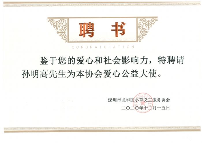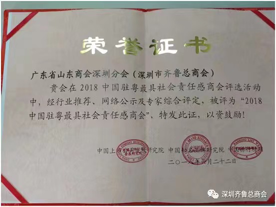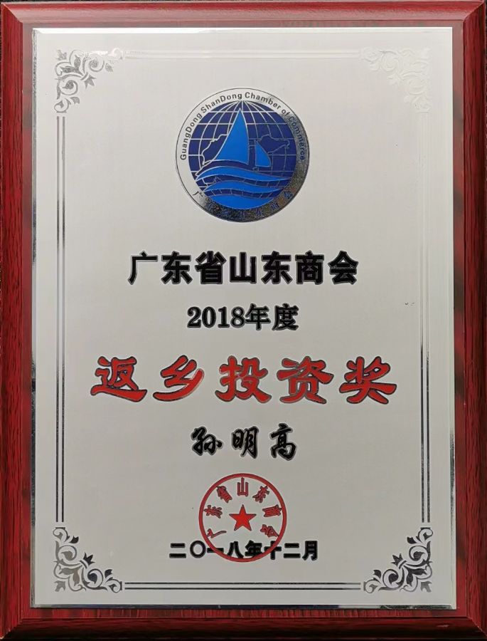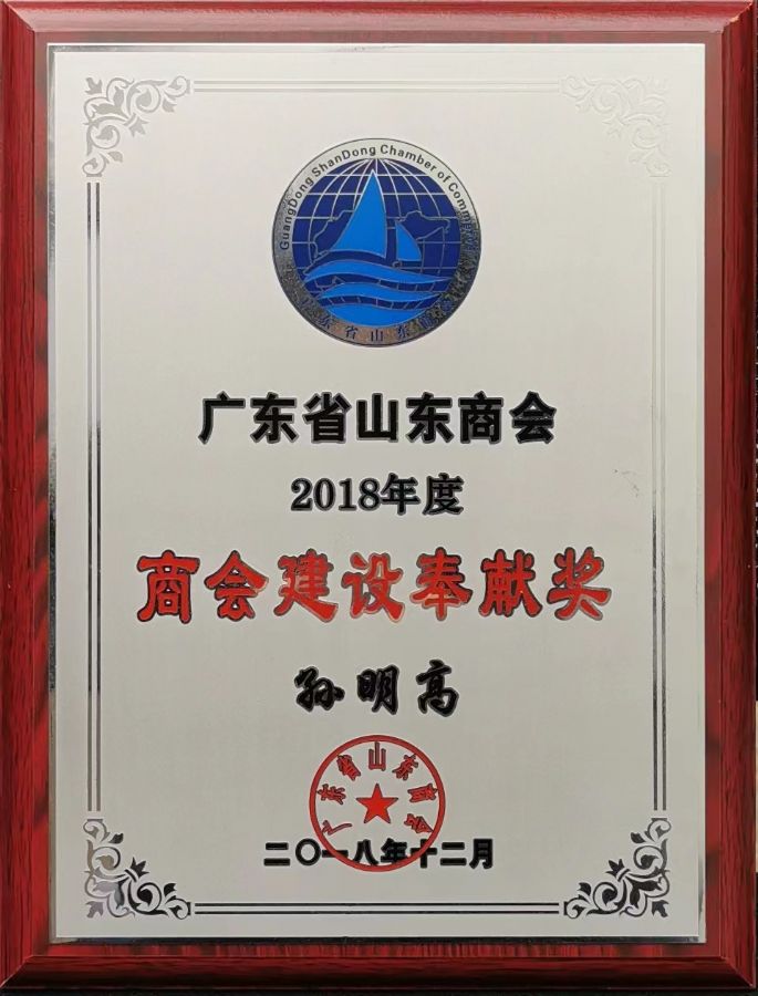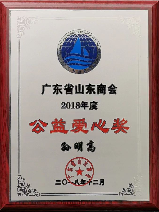 为此,孙明高会长先后荣获齐鲁英才“十佳年度人物”“孔子奖章仁爱奖”“新中国成立70周年莱州统一战线-最具影响力人物”“新中国成立70周年-社会责任企业家”“第八届中国企业家发展年会-卓越人物奖”“中国优秀创新企业家”等称号。广东省山东商会授予孙明高会长“十周年商会发展突出贡献奖”“抗击新冠肺炎疫情先进个人”“十周年返乡投资奖”“十周年公益爱心奖”。