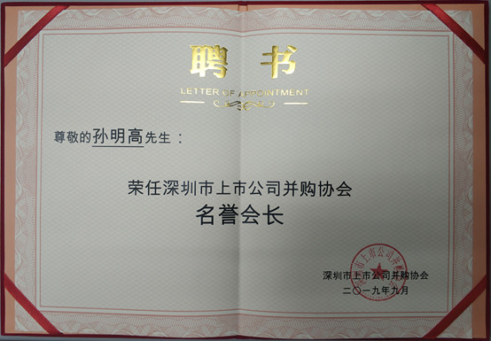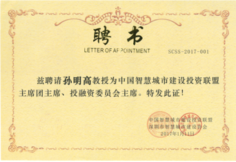 此外,孙明高会长还担任中国智慧城市建设投资联盟主席团主席、投资委员会主席,深圳市上市公司并购协会名誉会长;工作之余还带领团队对企业吸收合并、增发新股、投行业务创新、资产重组、风险投资管理及员工持股计划等相关问题进行深入研究。