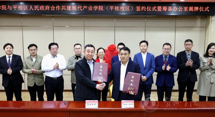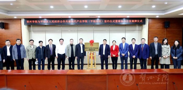 仪式上,吴郭泉校长、周诚区长代表双方签约,并共同为“现代产业学院(平桂校区)筹备办公室”揭牌。