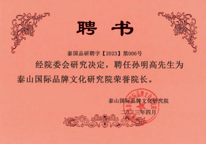 鉴于,孙明高会长兼任粤港澳大湾区品牌研究院荣誉院长、首席经济学家,在品牌管理、品牌战略、品牌塑造等方面的突出贡献和影响力。近日,泰山国际品牌文化研究院聘任孙明高会长为荣誉院长。