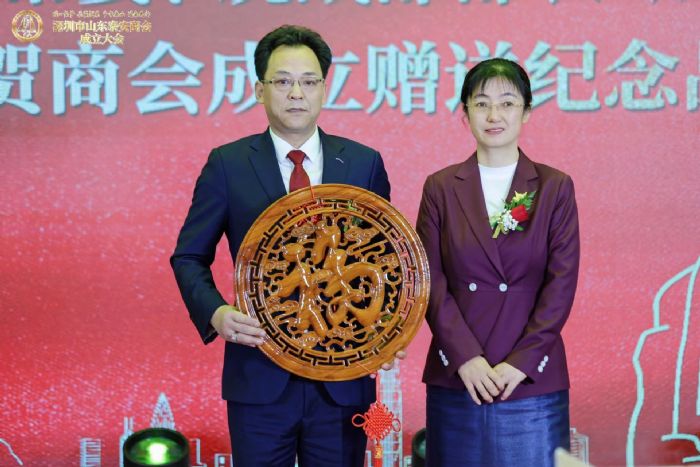 活动期间,成丽部长代表泰安市委常委、统战部向深圳市山东泰安商会赠送了成立纪念品“桃木福盘”摆件。