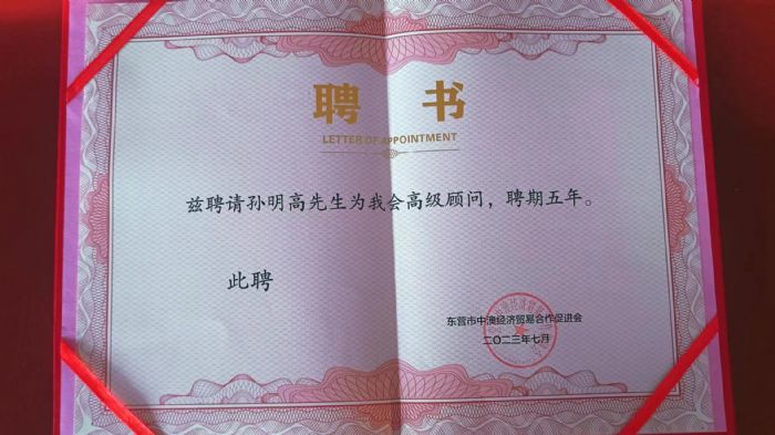 长期以来,孙明高会长作为商会的领头人积极投身于商会建设、社会发展当中,建立了内引外联、合纵联横的“四梁八柱”框架体系,积极配合各地市政府做好海外联谊的工作,并在国内外教育、文化、经济的合作与交流做出了突出的贡献。基于此,近日,东营市中澳经济贸易合作促进会特聘孙明高会长为高级顾问。