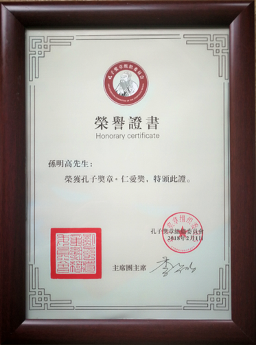 除了孔孟文化以外,孙明高会长还大力弘扬“格物致知,知行合一”的阳明文化。为此孙明高会长荣获“孔子奖章仁爱奖”,践行儒家思想、儒家学说,弘扬儒商文化,传承儒商精神。