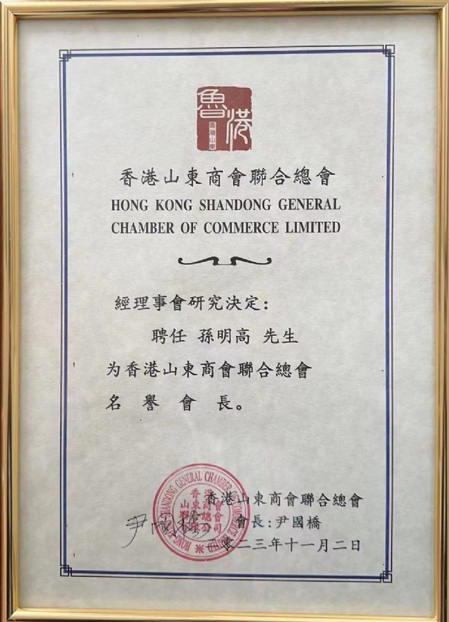 鉴于,孙明高会长是集政产学研金智文会于一身的复合型专家、学者、社会型企业家、投资银行专家和独立经济学家。近日,孙明高会长荣任香港山东商会联合总会名誉会长一职。