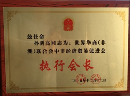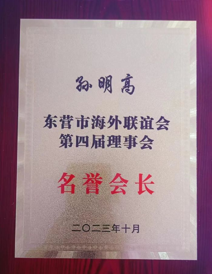 孙明高会长先后担任世界华商(非洲)联合会中非经济贸易促进会执行会长、世界关公协会名誉会长、美国中美艺术家基金会荣誉会长、美国佰老汇会员、亚太杰出企业家协会荣誉会长、全球互通精英俱乐部副理事长、深圳中非经济促进会名誉会长等职务,深入开展多种形式的联谊活动,促进山东与世界各地文化方面的合作与交流。