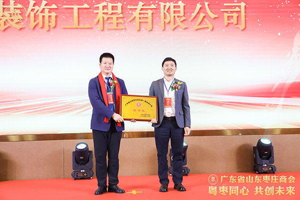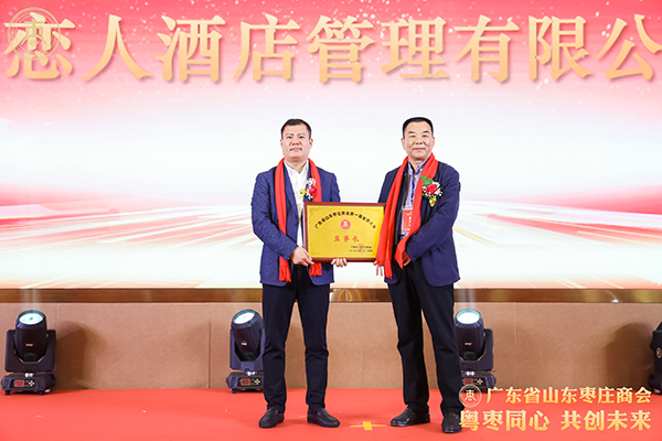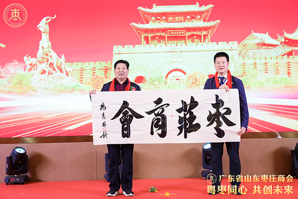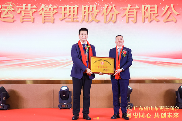 广东省山东枣庄商会王广军会长为广东省山东枣庄商会李强秘书长颁发牌匾